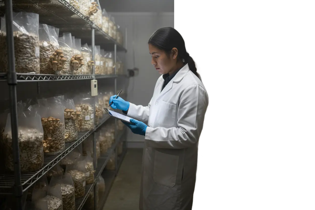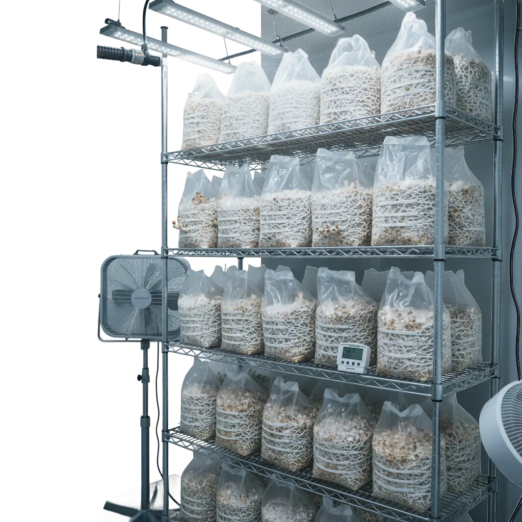 Una vez inoculadas las unidades de fructificación (mushbags), el micelio requiere un ambiente óptimo para colonizar el sustrato antes de producir frutos: